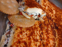 On a large piece of wax paper, roll out the Velveeta Cheese to a 13 inch by 18 inch sheet. This takes a while the first time, so be patient. Spread cream cheese on top of the Velveeta. Top that with the Olives, Jalapenos and Pimentos. Fold each side of the cheese sheet so it is 13 inches by 9 inches and that it meets in the middle. Turn it over so that the seam is on the bottom. Sprinkle the top with Paprika and refrigerate for 8 hours.